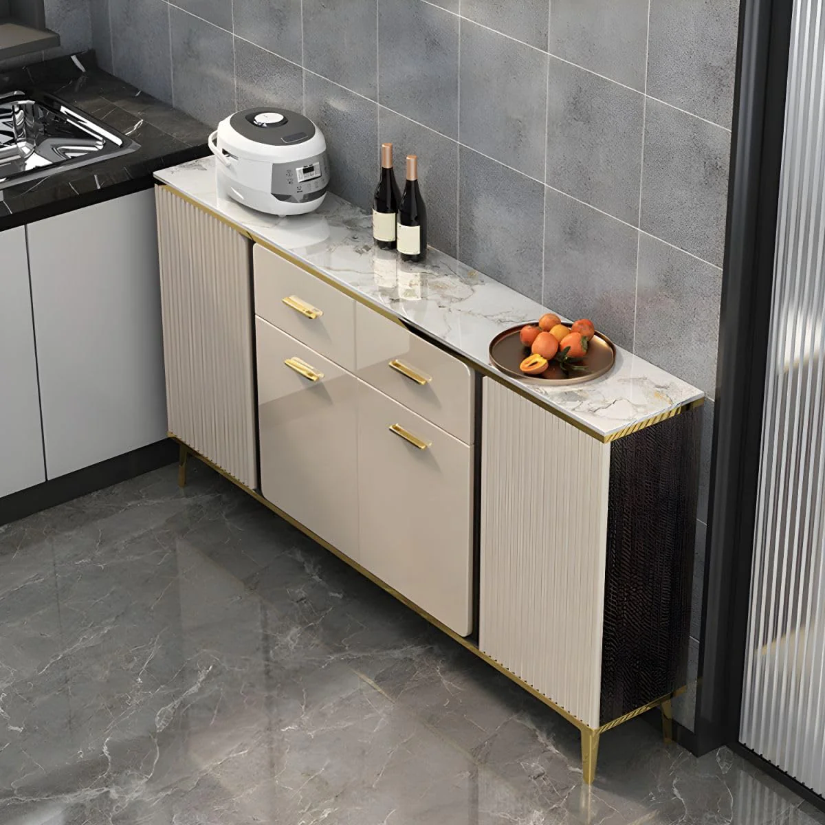 Our Marble Top Sideboard Coffee Bar Cabinet offers extensive storage options to keep your living space clutter-free. Two spacious cabinets with elegantly detailed doors open to reveal adjustable shelving, allowing you to customize the interior to accommodate your specific needs. Whether it's fine china, glassware, or everyday essentials, this cabinet has room for it all.
